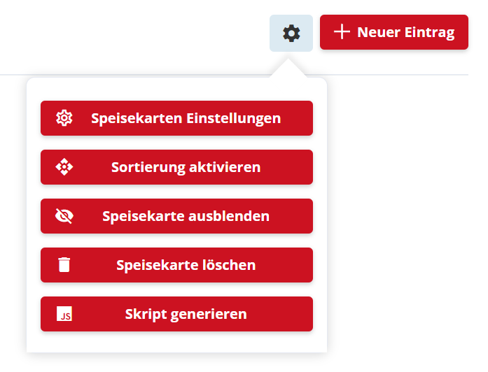 9. Ist die Speisekarte veröffentlicht, können Sie erneut auf das Zahnrad klicken. nun erscheint eine weitere Option "Skript generieren" über diesen Knopf wird ein Skript/Code generiert, welchen Sie auf Ihrer Seite einfügen können, damit Ihre Speisekarte immer auf dem Aktuellsten Stand ist.