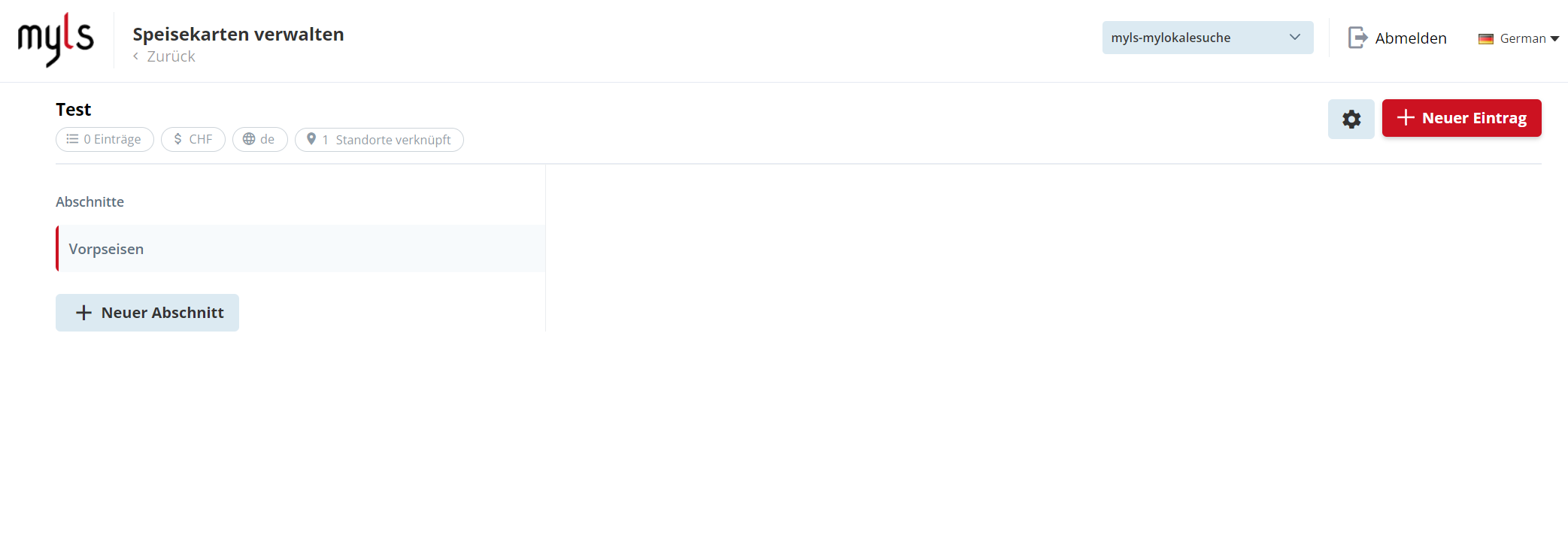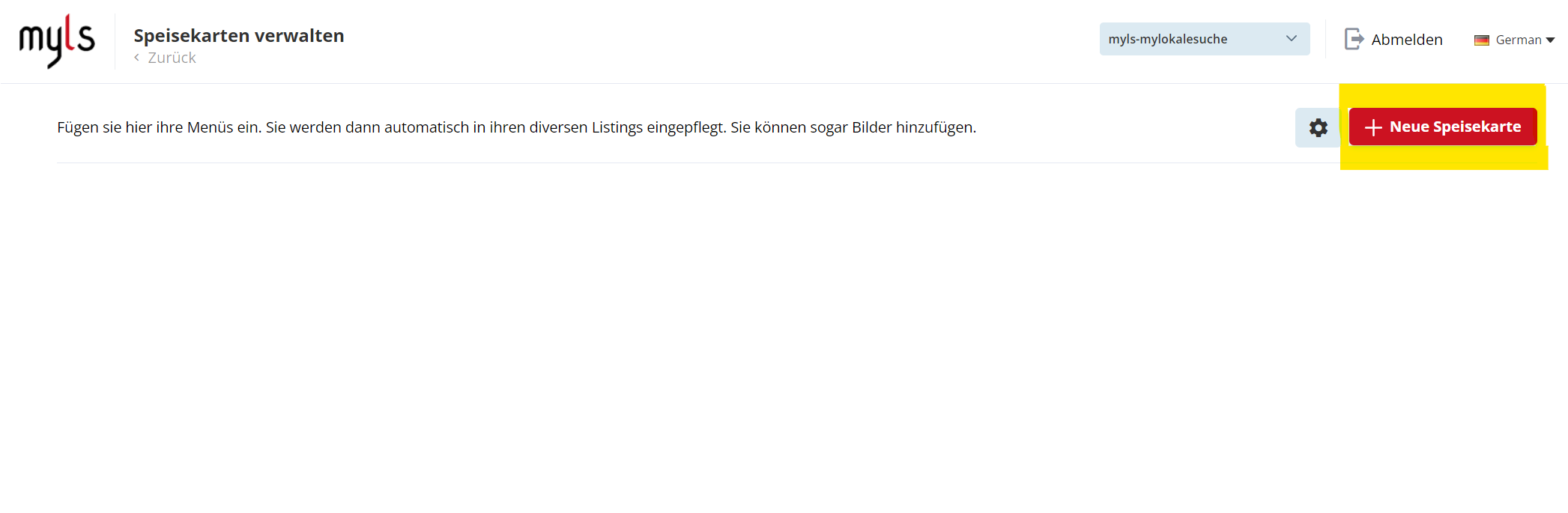 2. Wenn Sie noch keine Speisekarte erstellt haben, erscheint nun eine leere Seite. In der rechten oberen hälfte wählen Sie "Neue Speisekarte"