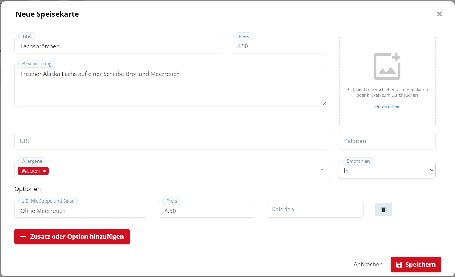 6. Falls es Variationen wie z.B. eine normale oder eine kleine Portion gibt, können Sie das ebenfalls einrichten. Dafür gehen Sie unten auf "Zusatz oder Option hinzufügen"