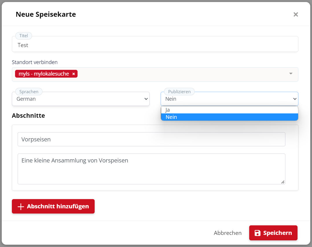 3. In diesem Fenster können Sie Ihre Speisekarte benennen und mit Ihrem Eintrag/Standort verbinden. Zudem können Sie die Sprache wählen.