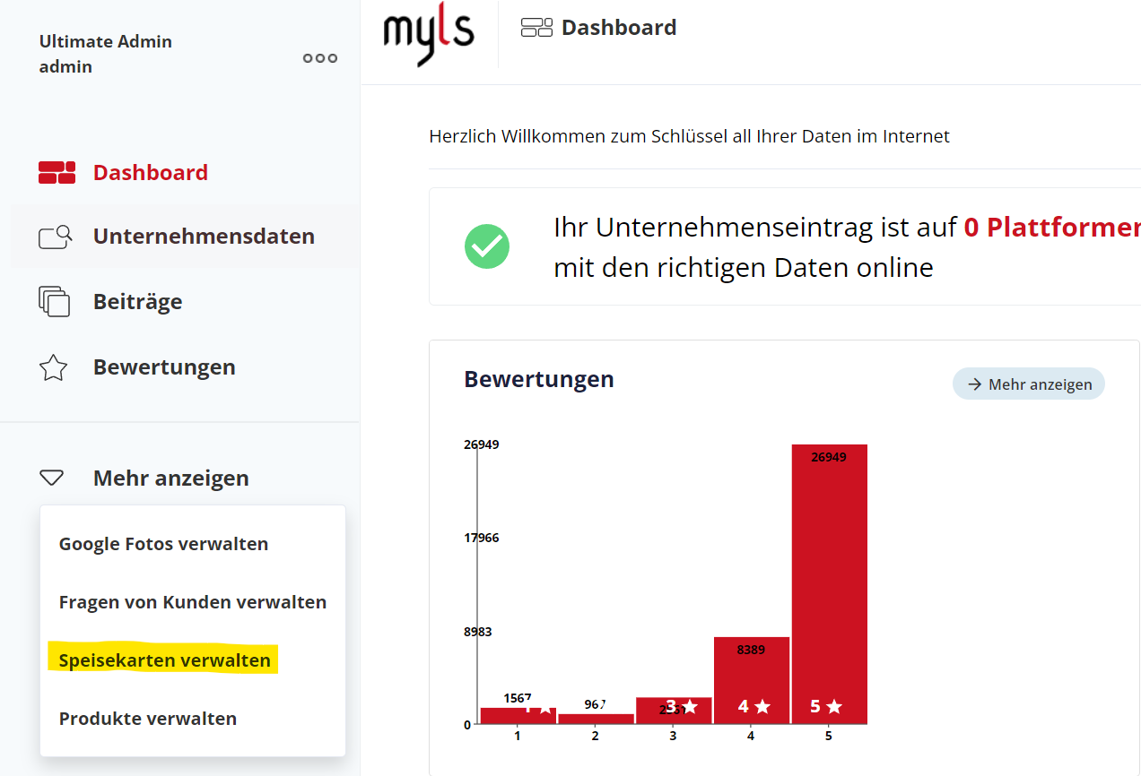 1. Loggen Sie sich auf dem System ein und klicken in der Seitennavigation auf "Mehr anzeigen" und dann auf "Speisekarten Verwalten".