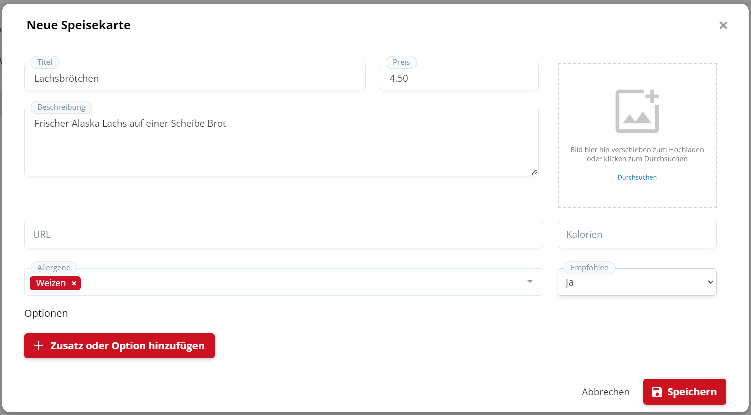 5. Es erscheint ein neues Fenster in welchem Sie die Jeweiligen Produkte oder Menüs erfassen können.
