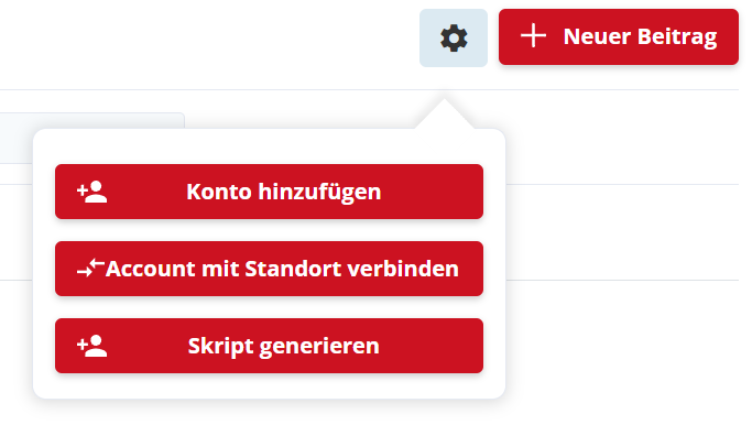 1. Auf das Zahnrad und auf Skript generieren klicken. 2. Eindeutiger Skriptname eingeben und auf Skript generieren klicken. 3. Generiertes Skript kopieren und auf der Webseite im Body dort einfügen, wo die Beiträge angezeigt werden sollten. 4. Code ...